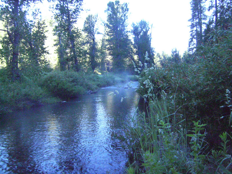 Jackson and I decide to hit the stream behind the campground, but in order to make it work with the move we need to be up early. Not sure what the fishing will be like at 7 AM, but we decide to give it a shot. I wake up around 6 and get Jackson up at 6:30. He pops out of bed, fixes his breakfast and we head down to the stream. We walk about half a mile downstream and wade in. It is VERY cold this morning (mid 50’s) and there is steam rising up off the water and you can see your breath. The step in is very invigorating. We start to slowly work our way up steam, fishing the same types of spots our guide pointed out yesterday. No hits all morning, and Jackson keeps getting his line tangled up. Our legs are numb (as are other parts for Jackson as he is often in waist deep). Our feeling is that we are out too early. There is not a single bug in the air. We do get a couple takes, but nothing we can hook.