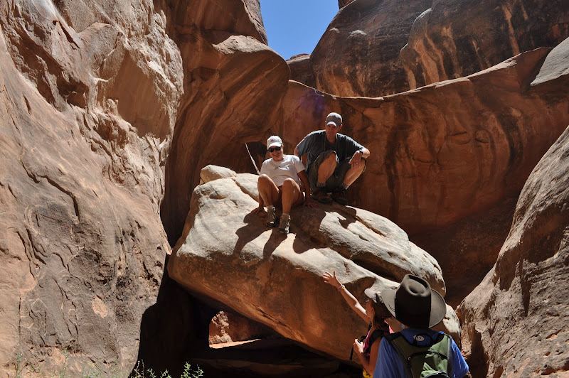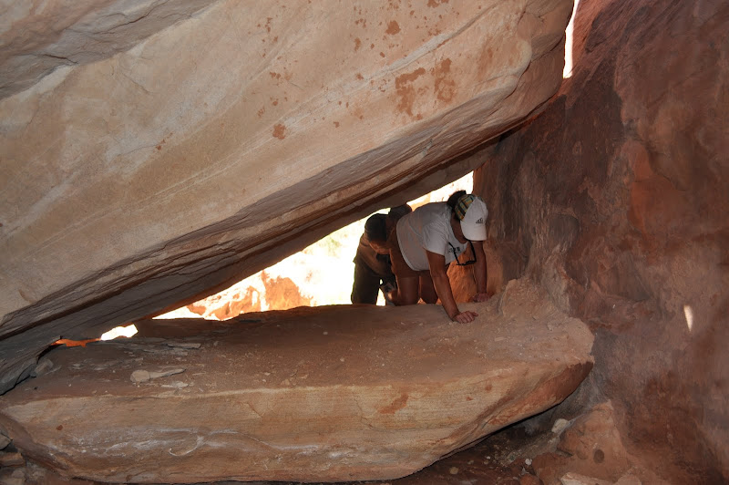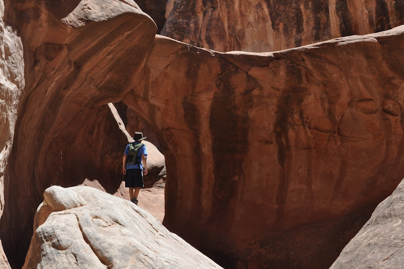 Off to the Furnace. This hike will take us down some rocks and into a bunch of fingers of caverns. Many of the fingers are dead ends; some go deep into the formations and branch off in many directions. Although I have my GPS, we will heed the advice of the ranger who first described it and keep an eye on the compass also. The GPS can lose its signal deep in the formations and will not leave you a track out. The first few fingers we head into are quick dead ends and, but then we hit one with some great walls and formations. The next one has us running into a group of scouts who have been in all morning canyoneering. They have ropes and I explain to Jackson that it is the only way to safely get into some of these areas. Some of the dead ends have a short climb down that will lead to new paths, but you have to make sure you can get back out. We hit a couple other fingers that have some arches and great spots to climb. Some require you to squeeze between or under rocks or climb over boulders to continue on. After over an hour of exploring, we decide to hike out.