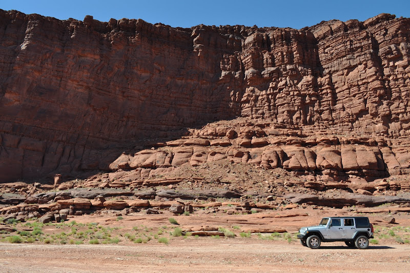 We drive back to the campsite for a quick lunch. The temp is now over 103 and we decide that more hiking is not in the plans for today. We opt instead for a Jeep ride on Shafer Trail. The people at the rental suggested this as a very scenic route and rated easy to moderate. 19 miles of twists and climbs ending in switch backs that take you from the canyon floor to the top of the ledges.
