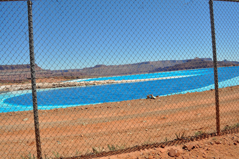 The trial starts along the Colorado and into the town of Potash. This is a big potash mining area. It continues along some twists and up rocks and ledges. Some fun stuff, but I only need to get it into 4 wheel low a couple times. We are looking up at Dead Horse Point and the formations from the bottom. We then continue on past some potash evaporation ponds. They extract the potash (which is used in fertilizer – a great source of potassium) by injecting water from the Colorado into the mine and pumping it miles to these holding ponds. In the hot arid climate (average humidity here is 20% in summer) the brine then evaporates leaving just the potash. They then scrape it out and haul it by train. The ponds are a very strange shade of dark blue and turquoise.