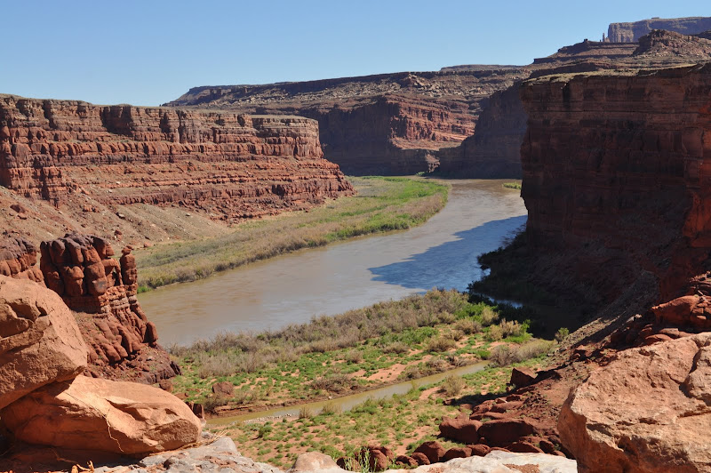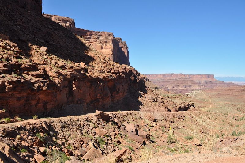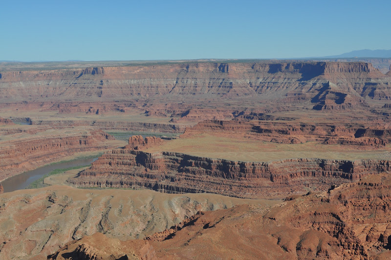 Finally at the top, we all breathe a sigh of relief and head (on paved roads) to Dead Horse Point. This is a state park with some magnificent views of the valley below. Cowboys used to round up horses in this area. They would drive them to the point as it is a large area with a very narrow (33 yards across) area that they could fence off to keep the horses in. The legend is that they left a large number of horses on the point with no food or water. Hence, Dead Horse Point.